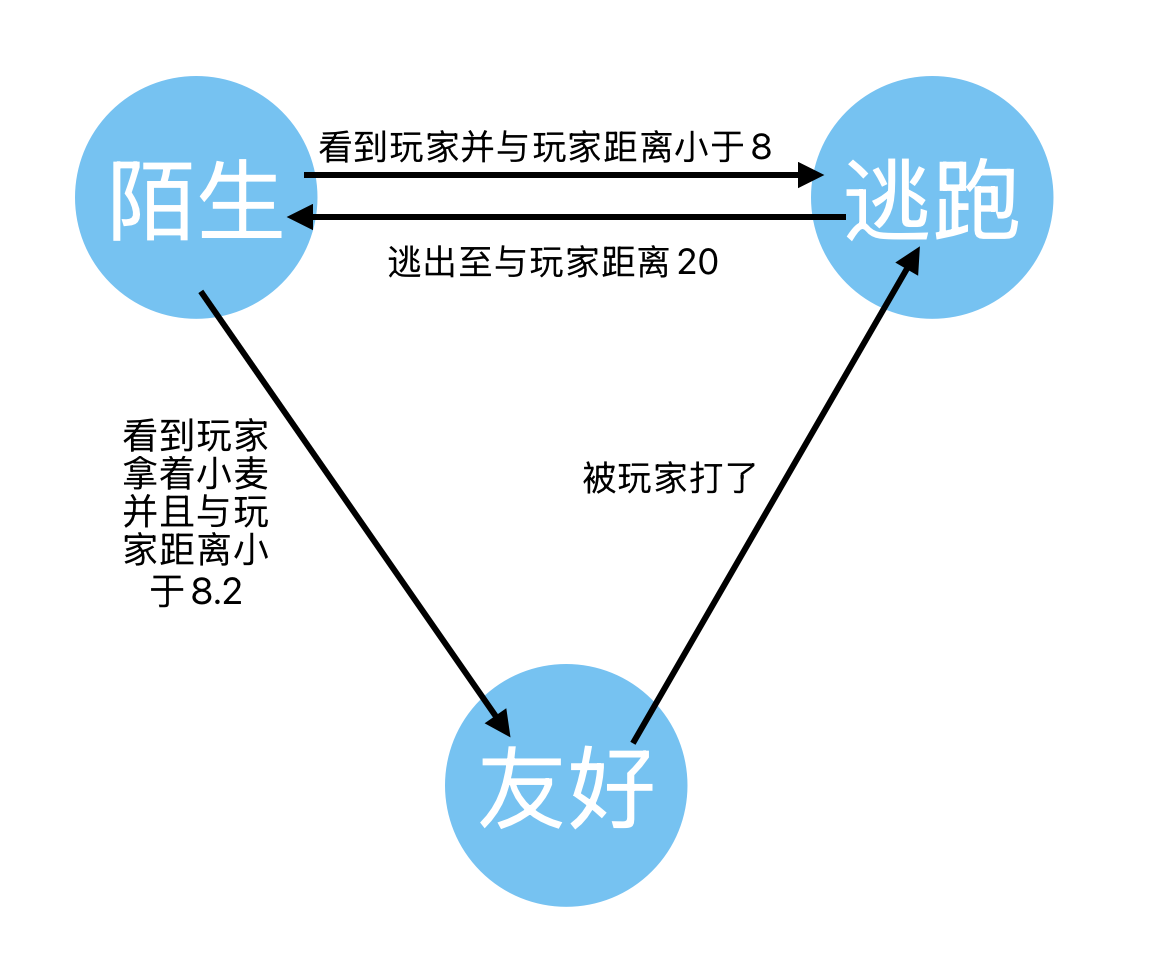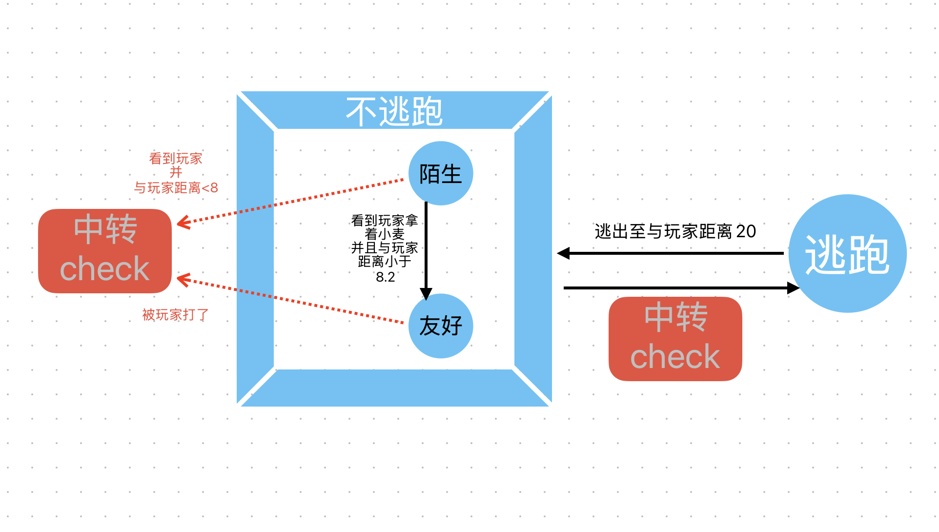 父状态机是‘逃跑-不逃跑’,存在的子状态机是‘陌生-友好’。